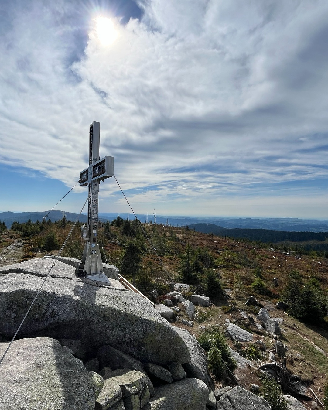 Na vrcholu nás čekal kříž, symbolické zakončení výstupu a nádherné panoramatické výhledy do Rakouska i na českou stranu. Vrchol Plechého je hranicí mezi Českem a Rakouskem.